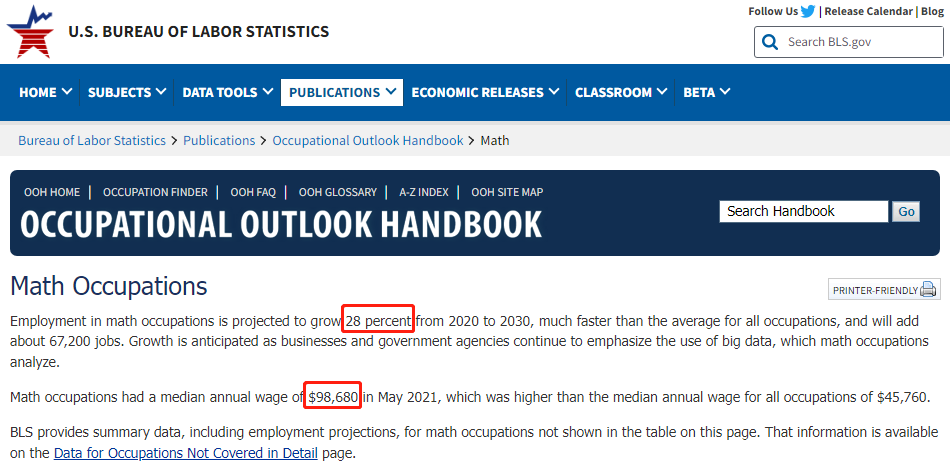 根据美国劳工统计局(BLS)统计数据显示,2021 年 5 月,数学相关职业的年薪中位数为 98,680 美元,远高于美国所有职业 45,760 美元的年薪中位数 。