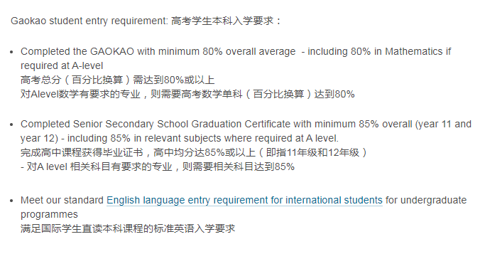 ● 本科要求高考成绩达到75-82%,高中一、二年级相关学科成绩总平均分在80%以上,并取得高中毕业证书;其中,江苏省考生要求高考成绩达到75-85%(总分百分比)或者江苏省内前 20-50%的学生,部分专业还要求递交A-Level数学成绩;