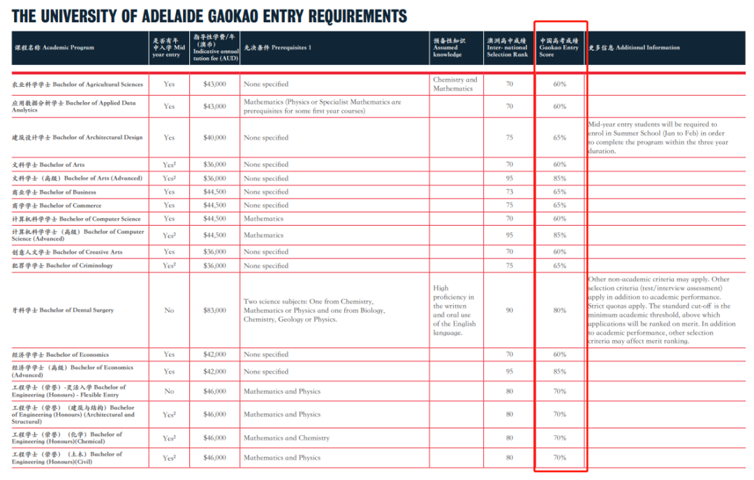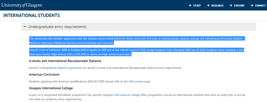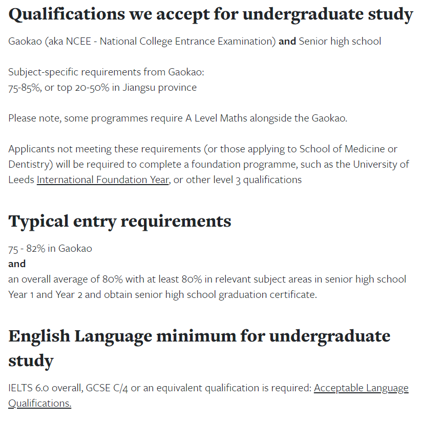 每所英国大学对于高考成绩的要求及其附加条件,比如高中三年平均分,英语成绩等,要求均有区别。大家在准备申请时可以先进入学校官网查询具体信息。
