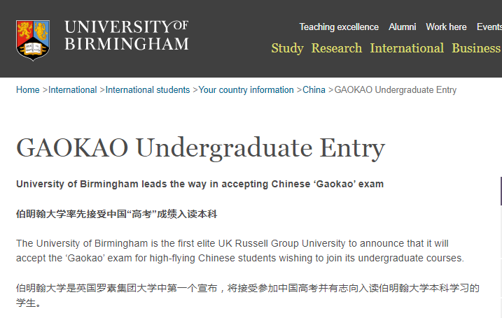 伯明翰大学是英国罗素集团大学中第一个宣布,从2019年开始接受参加中国高考并有志向入读伯明翰大学本科学习的学生。