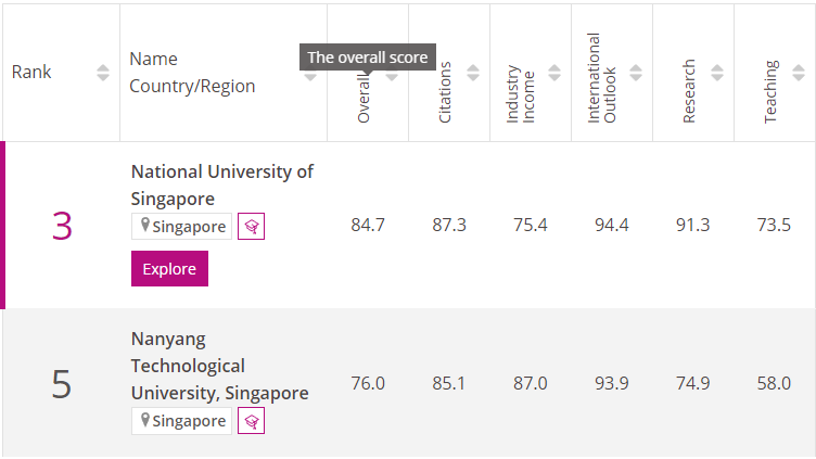 今年,新加坡的高校表现一如既往地稳定,新加坡国立大学和南洋理工大学和去年一样,分别位列亚洲第 3 和 第 5。