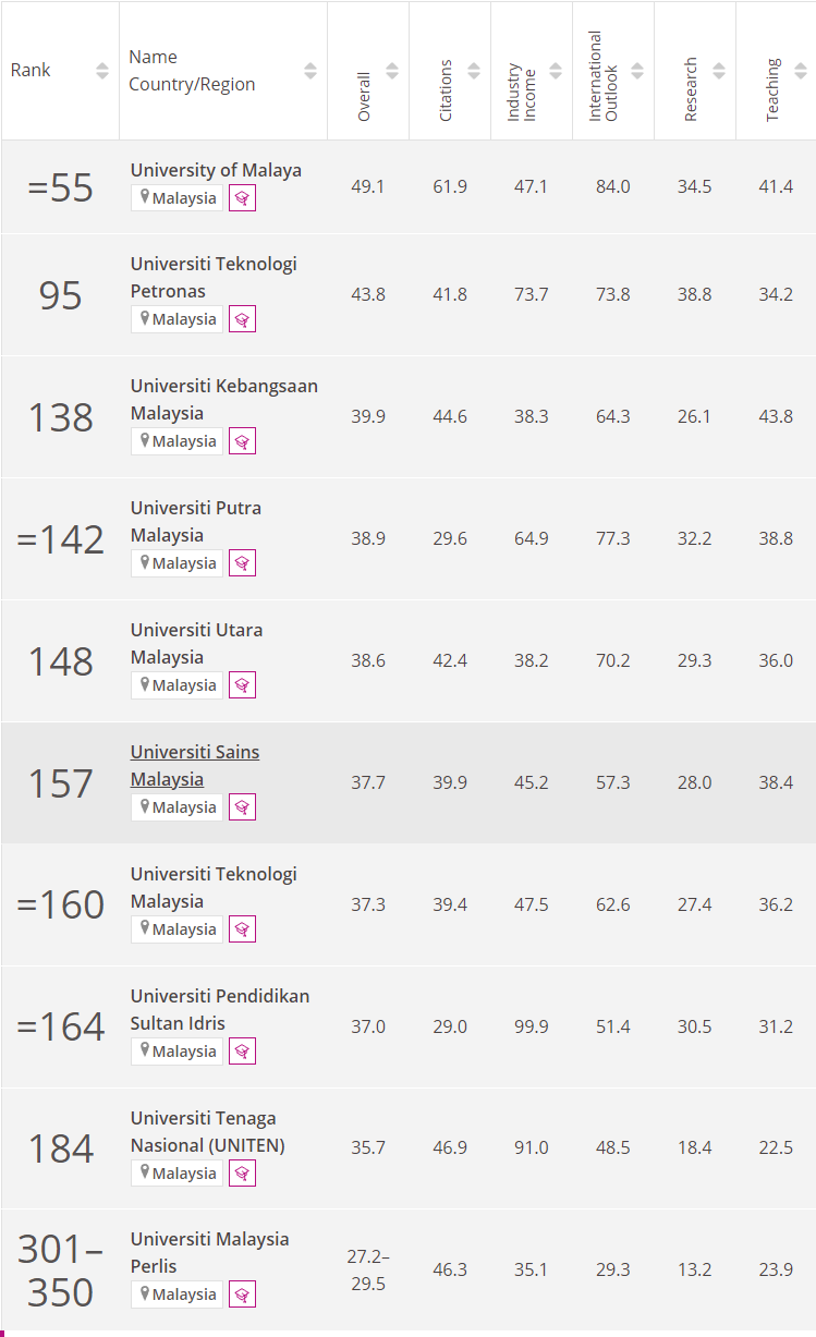 马来西亚排名第 1 的马来亚大学,较去年下跌 6 位,位列亚洲第 55 名;