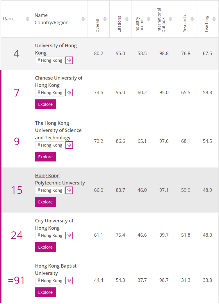 值得注意的是,本次香港理工大学进步 7 名,超越了香港城市大学,冲入亚洲 TOP20。