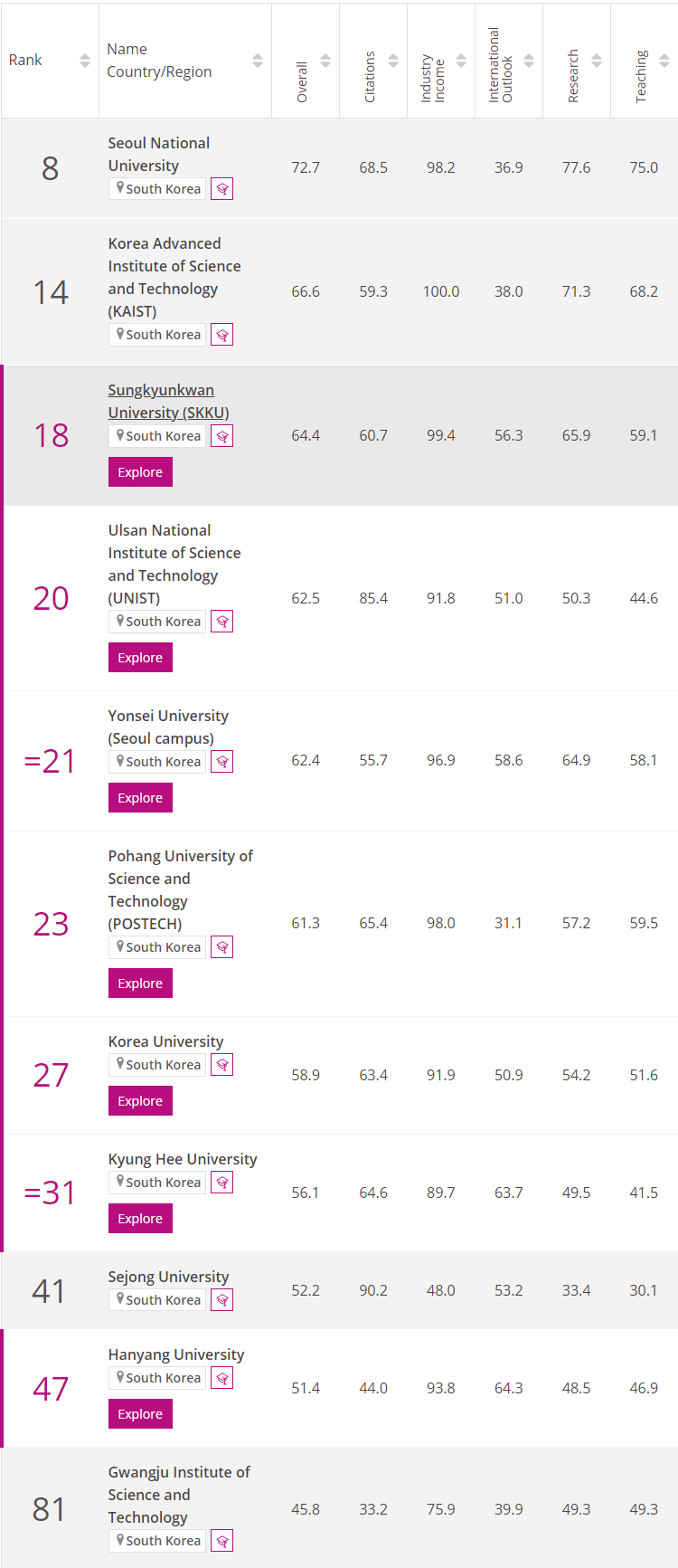 而 TOP20 榜单中,除了首尔国立大学外,还有 3 所院校上榜,分别是:排名第 14 的韩国科学技术高等研究院、排名第 18 的成均馆大学以及排名第 20 的蔚山国立科学技术研究院。