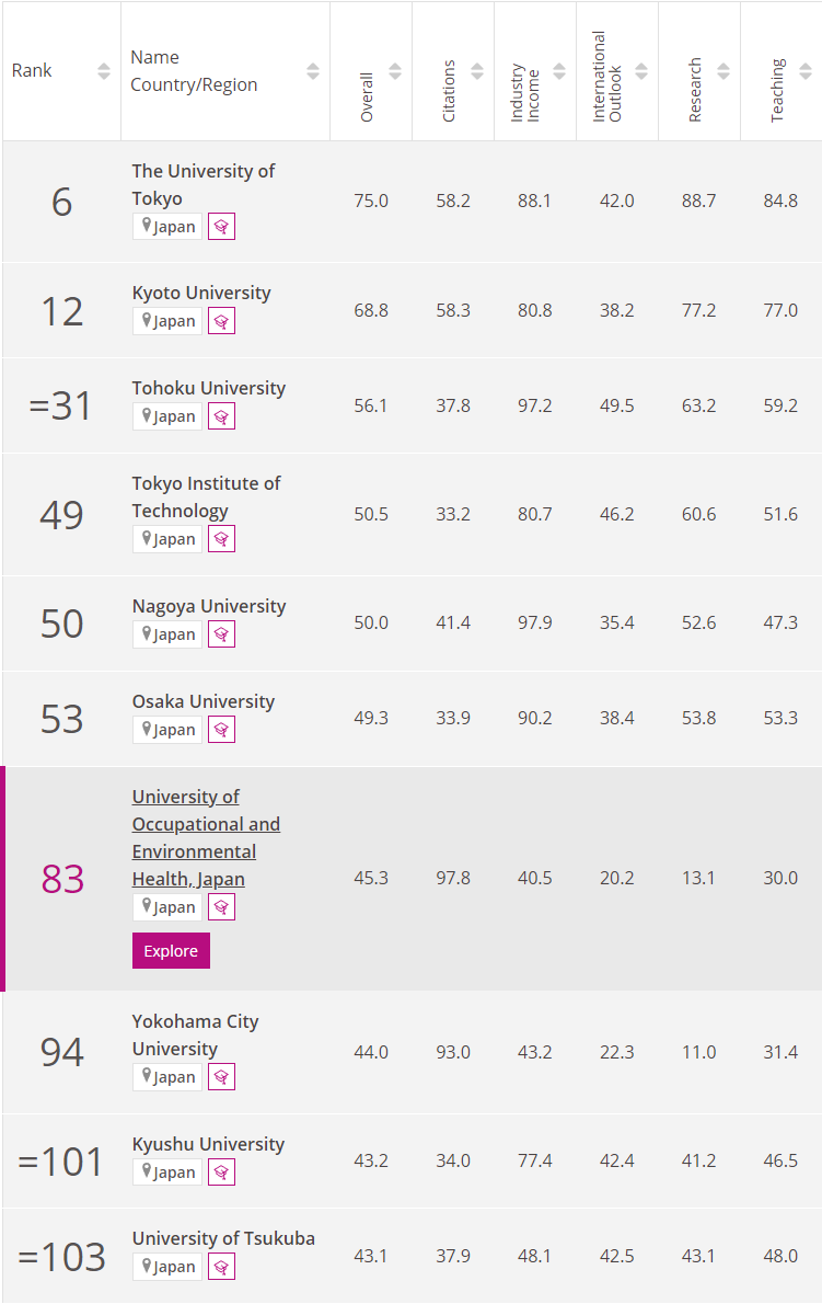 日本职业与环境卫生大学下跌 17名,位列第 83;