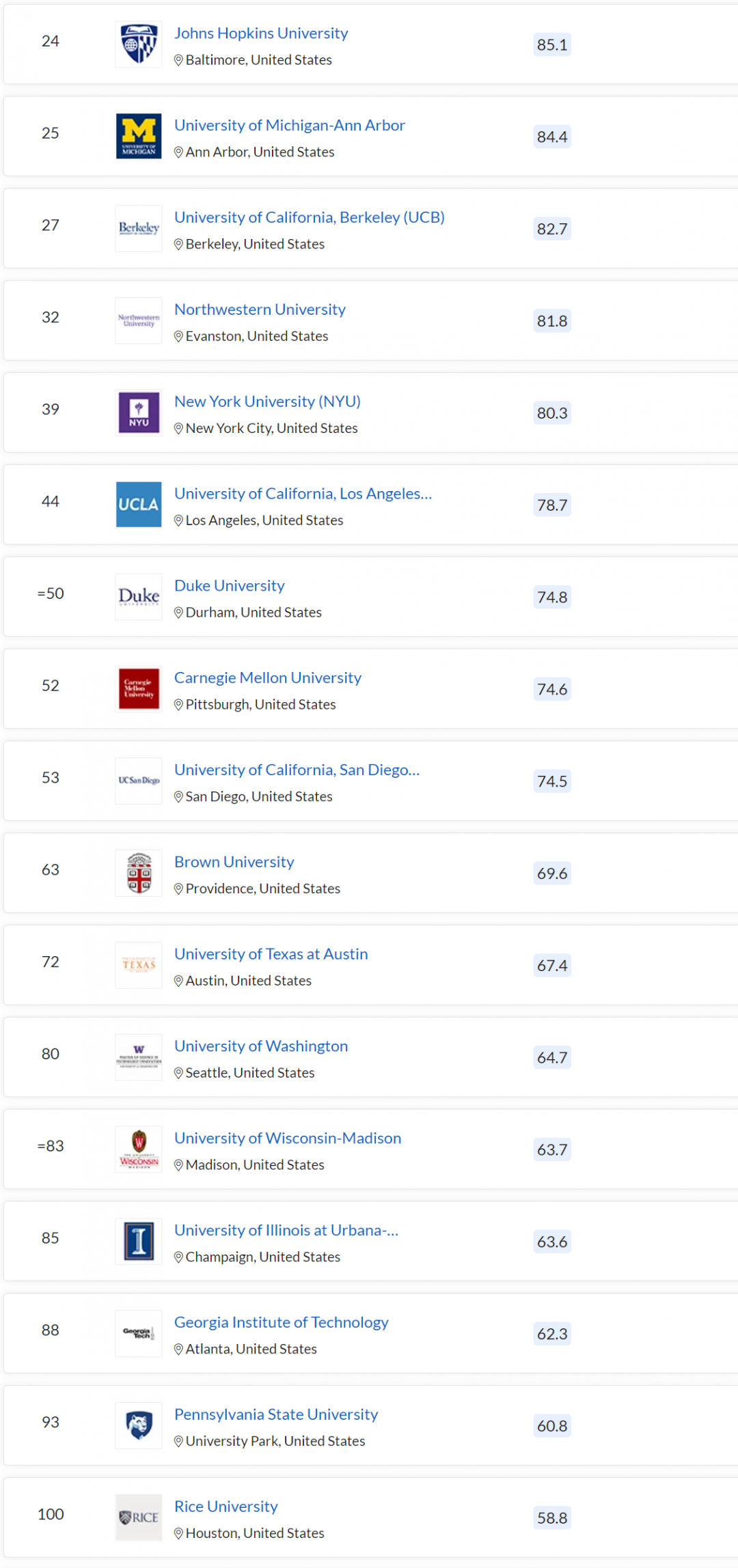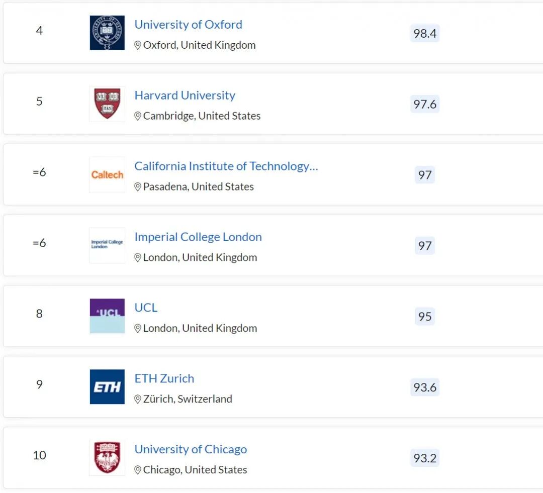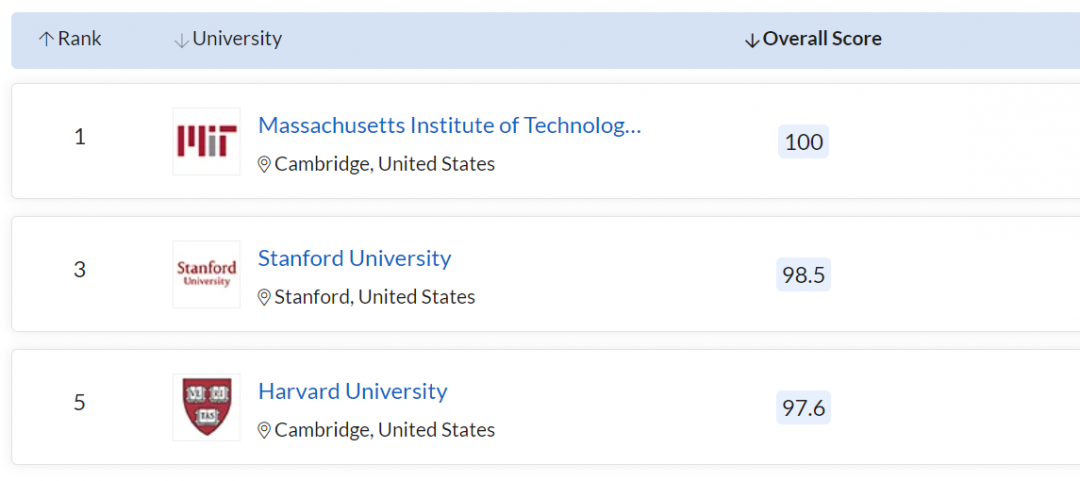 斯坦福、哈佛、加州理工、芝加哥大学进入 TOP10,排名与去年一致;