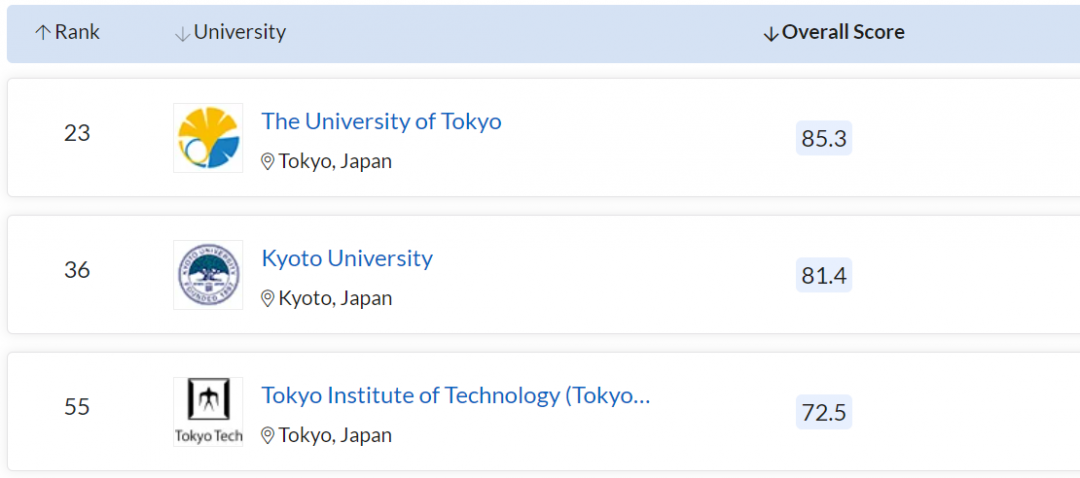 日本共有 5 所大学进入 TOP100,其中: