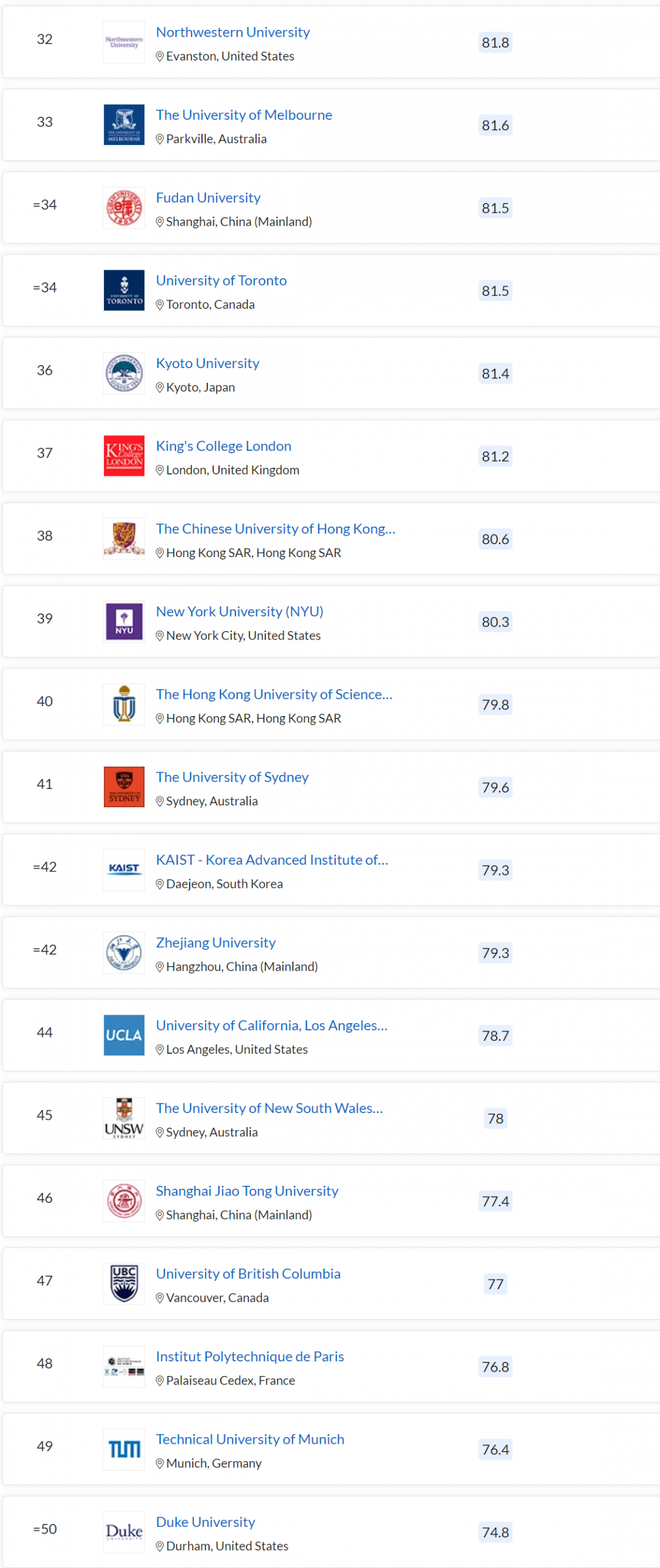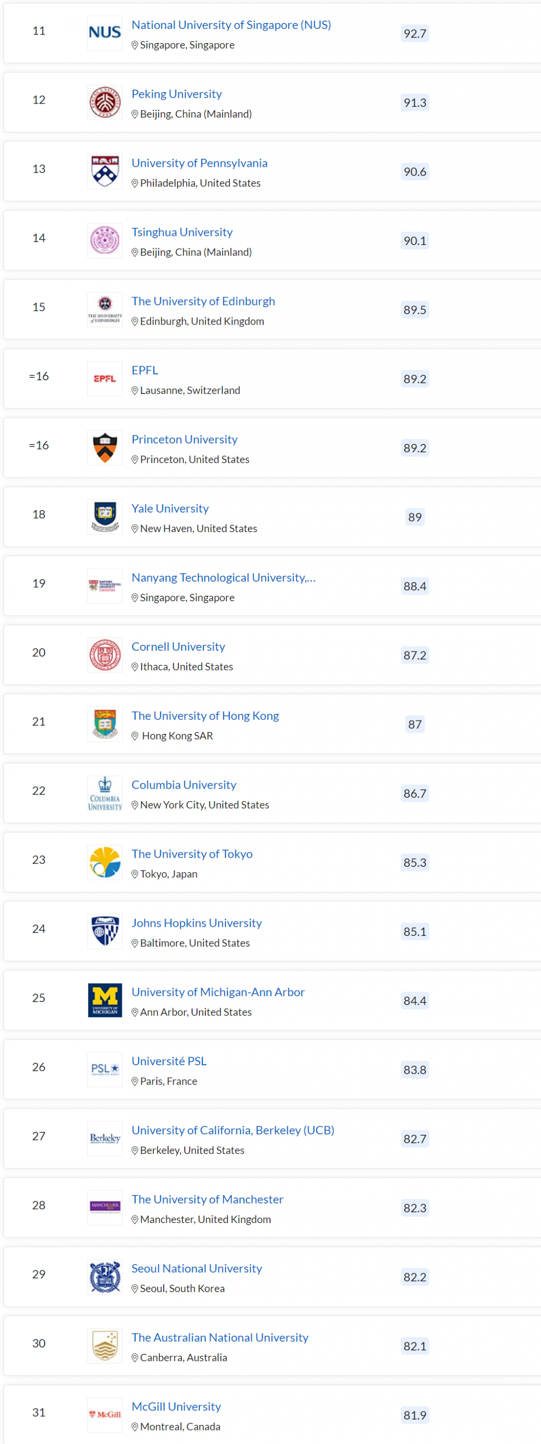 东京大学表现稳定,与去年排名一致,位列 23 名;
