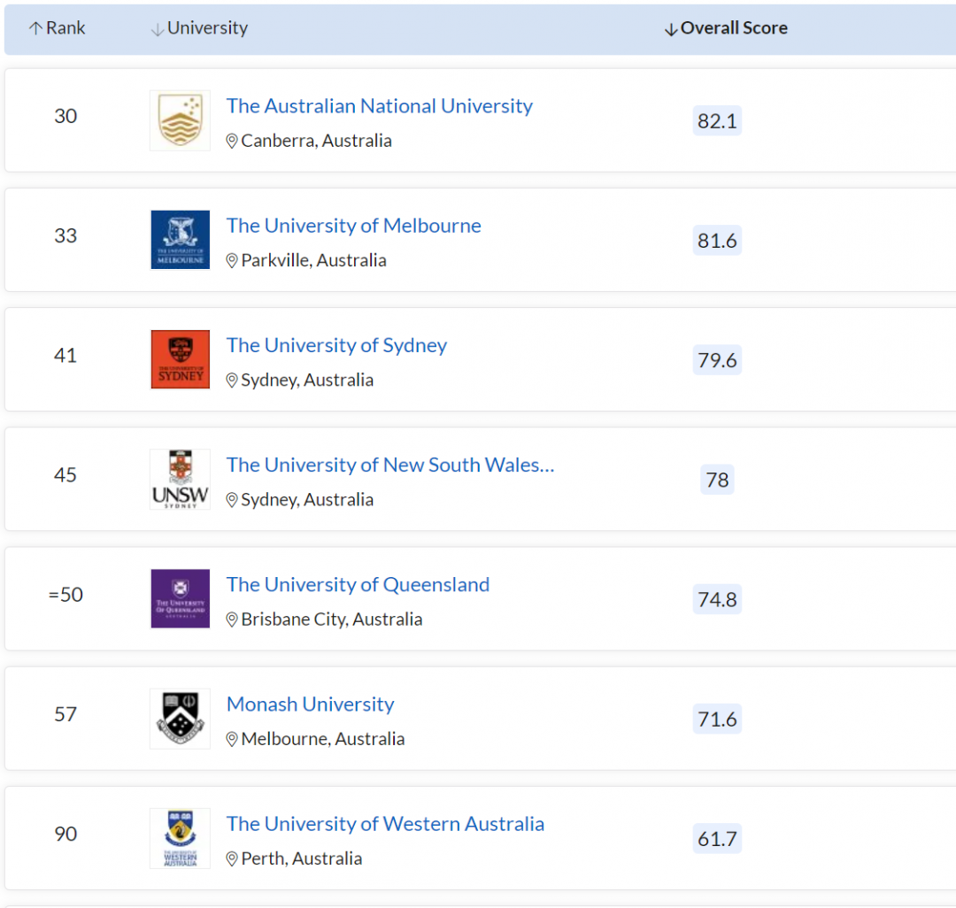 澳洲 7 所大学进入TOP100,其中: