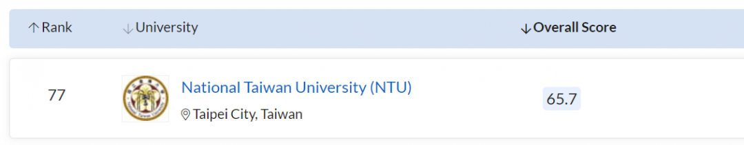 中国台湾大学进入 TOP100,位列 77 。