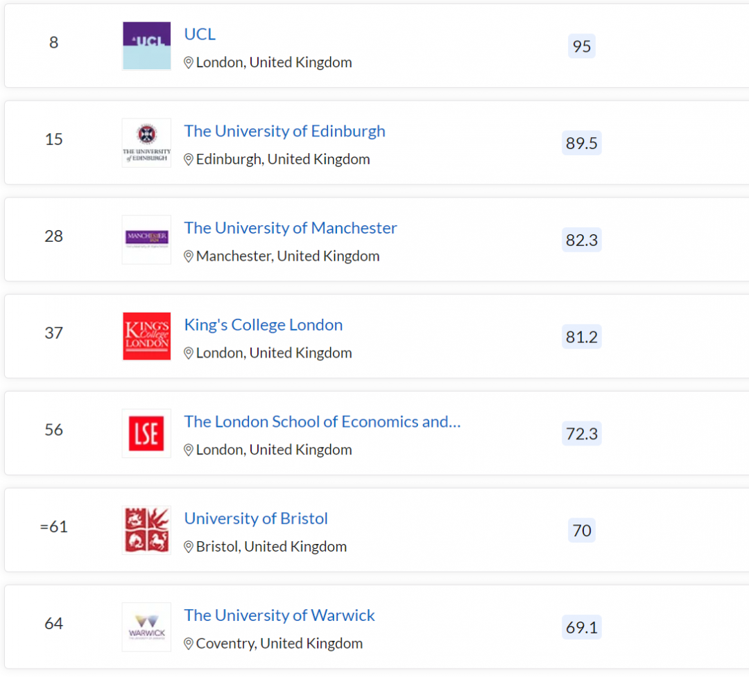 爱丁堡大学排名再次上涨,力压一众藤校,位列 15 名;
