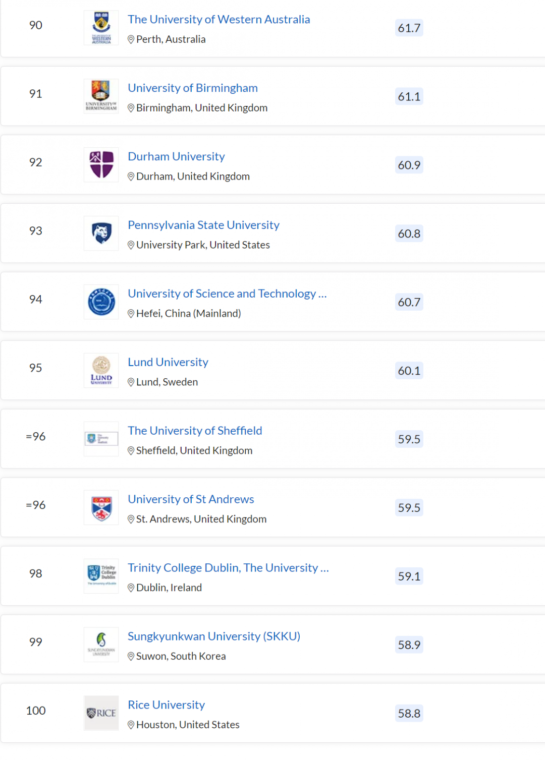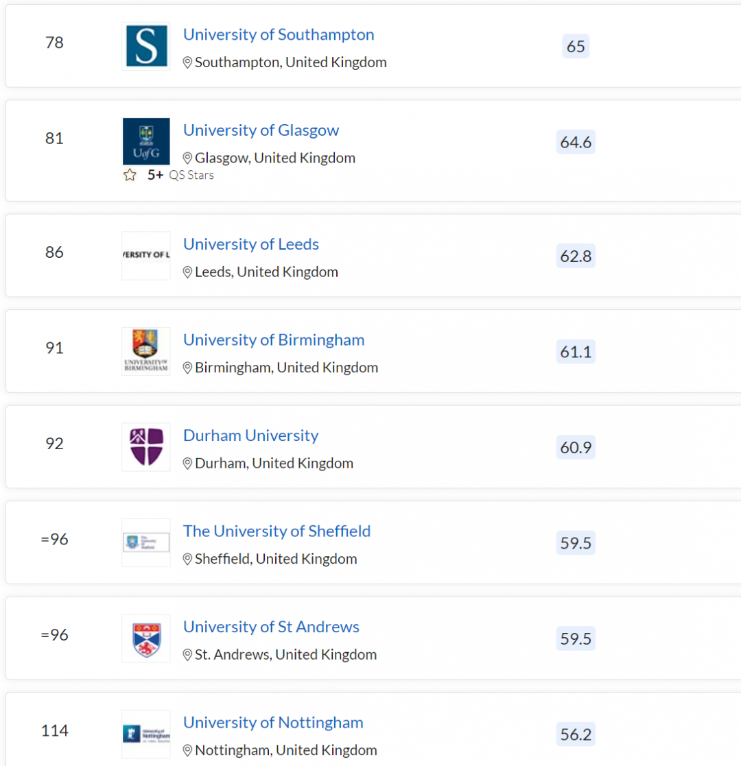 利兹大学上升 6 名,位列 86 名,超越了杜伦、伯明翰大学。