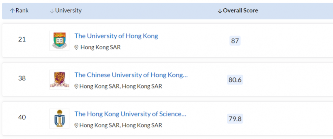 中国香港地区的大学名次稳定,3 所大学进入 TOP 50 ,其中: