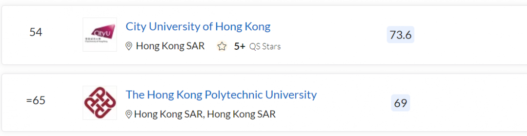 香港城市大学、香港理工大学均进入 TOP100。