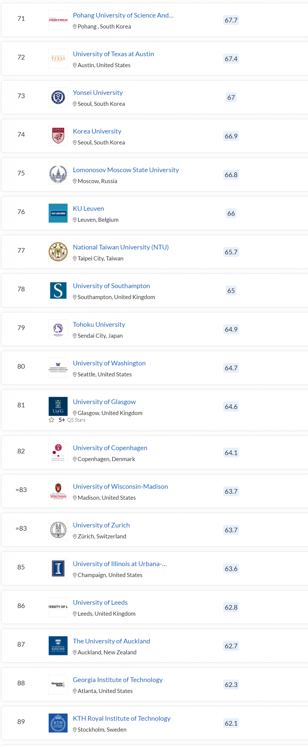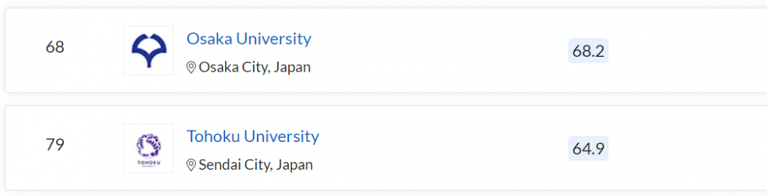 大阪大学上升 7 名,超过格拉斯哥大学位列 68 名;