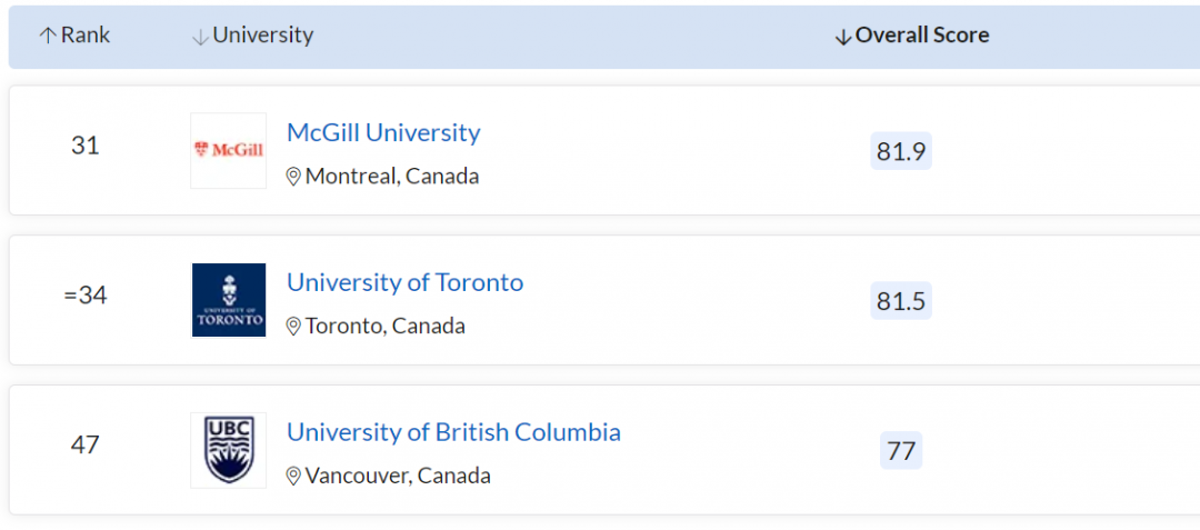 加拿大依旧是 3 所大学进入 TOP100,但相比去年整体名次有所下降,全员跌出 TOP30,其中: