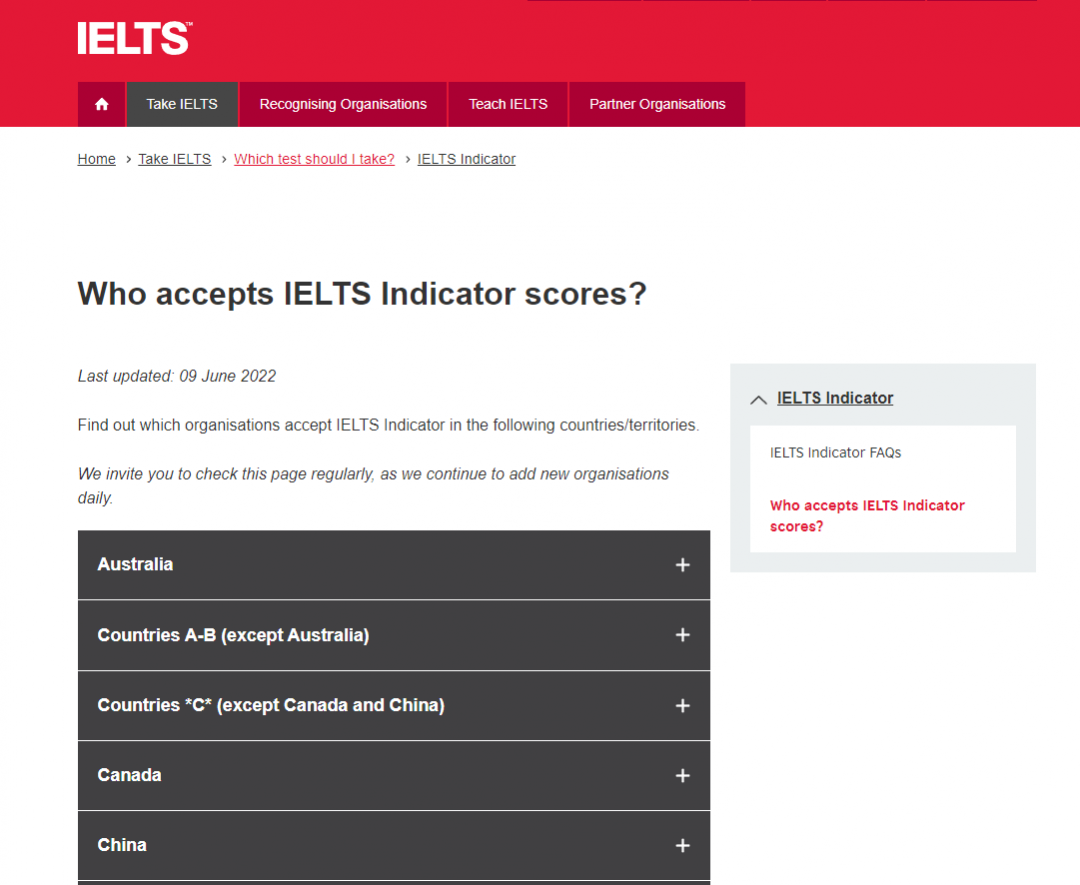 根据雅思官网 6 月 9 日最新更新名单,目前全球共有 63 个国家和地区、超 500 所院校都认可 IELTS Indicator 成绩,包括中国、美国、英国、澳大利亚、加拿大等都有名校承认!