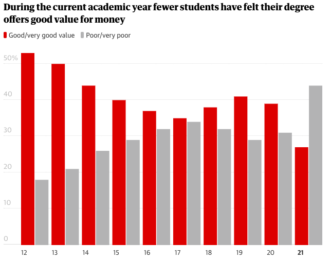 根据高等教育政策研究所调查的数据,2021年对课程感到失望的人数高达44%,这个数据是2019-20学年的两倍。大部分同学对线上课程表示失望不满意,并表示线上课程并不值得花费9000英镑。