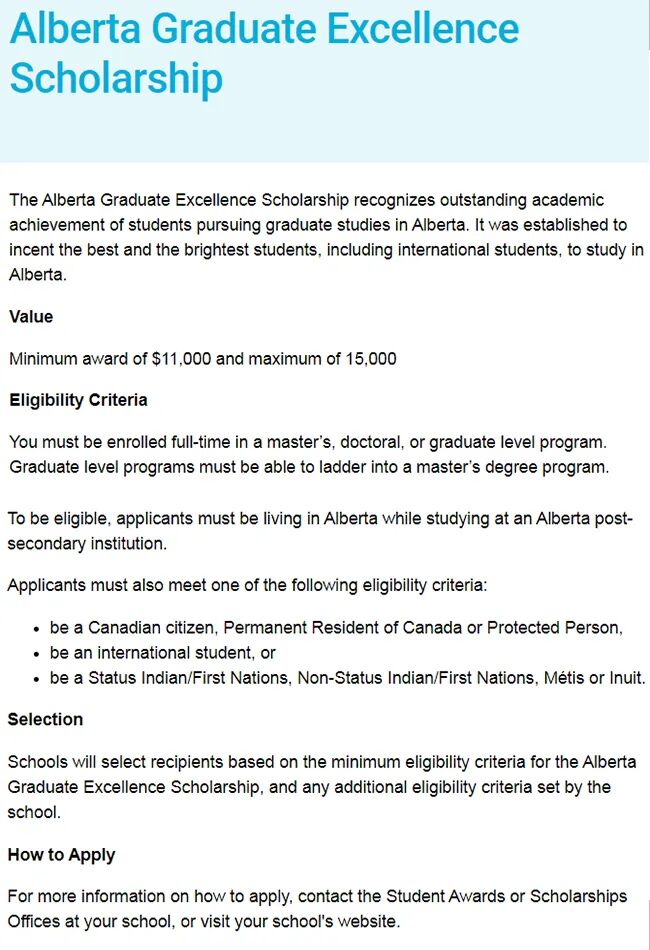 还有阿尔伯塔省研究生卓越奖学金(Alberta Graduate Excellence Scholarship),该奖学金用于表彰在阿尔伯塔省攻读研究生课程的学生的学术成就,包括国际学生。