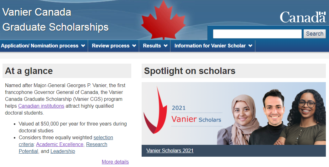 加拿大政府于 2008 年启动了凡尼尔研究生奖学金计划( Vanier Canada Graduate Scholarships),该奖学金旨在帮助加拿大院校吸引并留住健康研究、自然科学/工程、社会科学/人文学等领域的高质量博士生。奖学金金额为每年 50,000 加元,发放期为 3 年,申请者需要向学校提交申请。