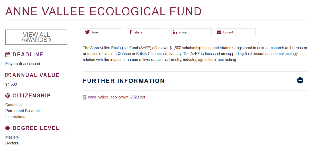 安妮谷生态基金 (Anne Vallee Ecological Fund)向在魁北克省或BC省的大学就读动物研究的硕士或博士学生开放,主要目的是为了支持与人类活动息息相关的动物生态领域的实地研究,金额为两笔 1,500 加元的奖学金。