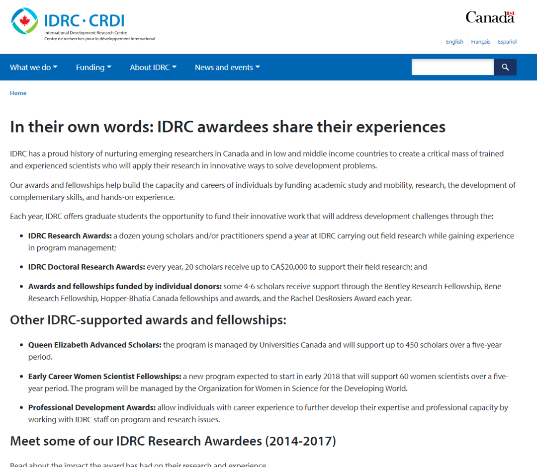 国际发展研究中心的研究奖学金(IDRC Research Awards / IDRC Doctoral Research Awards)是加拿大政府为来自发展中国家,并在加拿大指定大学攻读硕士或博士学位的国际学生所提供的奖学金,奖金最高可达20,000 加元,你可以通过学校或 IDRC 官网申请。