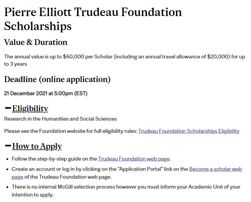特鲁多奖学金(Trudeau Scholarships and Fellowships)是特鲁多基金会提供的奖学金,该基金会向在加拿大指定院校攻读博士学位的国际学生,提供多项奖学金和研究基金,它要求申请者的研究领域广泛涉及与加拿大未来直接相关的人文或社会科学;它提供的奖金最高金额可达 60,000 加元,最长可发放三年。