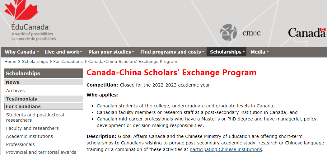 中加学者交流项目奖学金 (Canada-China Scholars Exchange Program)属于国家奖学金,一般是给参与中加短期交流项目的学生提供,奖学金通常用于在加拿大进行为期 4 到 12 个月的研究,但不涉及在加拿大大学的正式入学,获奖者被安排为访问学者,该奖学金一般需要在政府官网申请。