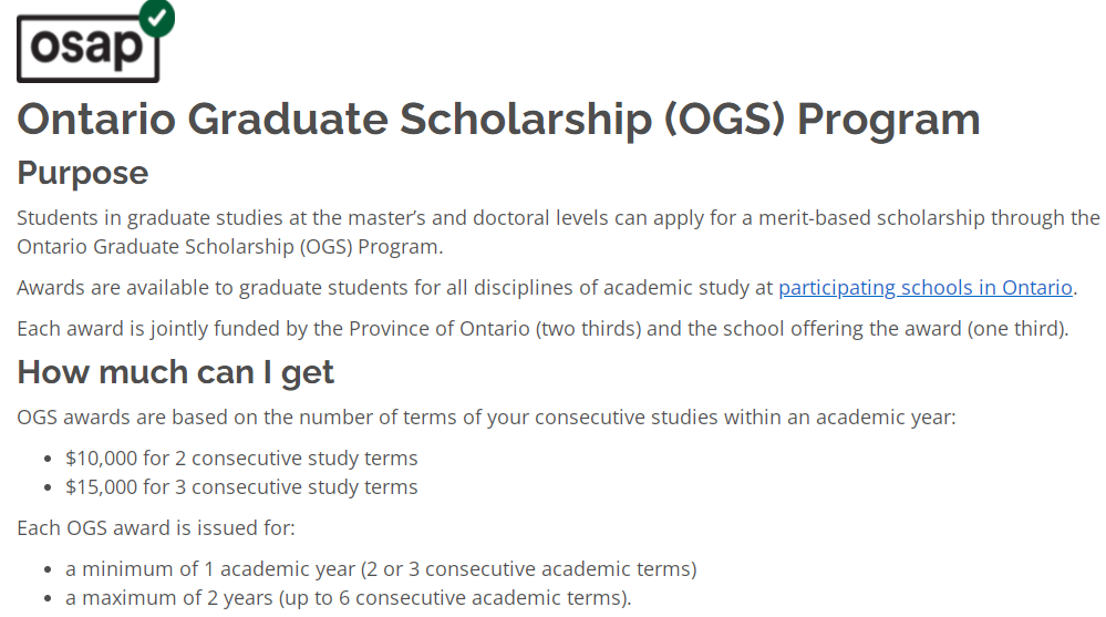 比如安大略省提供的研究生奖学金(Ontario Graduate Scholarship),该奖学金由省政府(占2/3)和学校(占1/3)共同出资,是一项基于学术成绩的奖学金,适用于所有攻读硕士或博士水平的研究生,包括国际学生。该奖项的金额多少是基于你一年学习多少个学期而定:1年连续学习2个学期为 10,000 加元;一年连续3个学习学期为 15,000 加元。可通过学校官网申请。