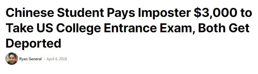 2018 年,21 岁女留学生 Leyi Huang 承认在美国宾夕法尼亚州立大学入学考试中作弊。因为考试成绩不能达到大学的最低分数线,她花了3000 美元找人冒名顶替自己参加托福考试,成为美国调查国际学生找“枪手”代考事件中又一沦陷者。最终等待她的,是严重的罚款和驱逐出境的处罚,否则将可能面临高达5年的刑期。