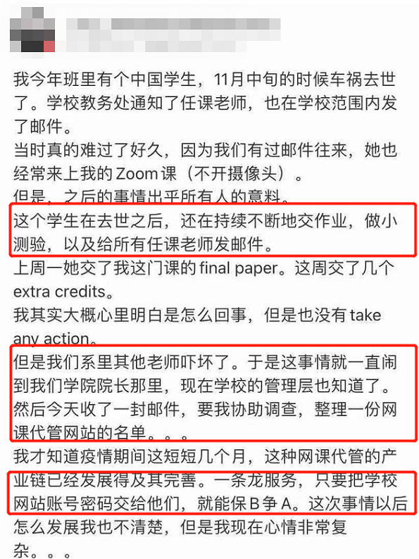 而在2020年,一则更加离谱的新闻冲上热搜。一名中国留学生遭遇车祸去世半年,却仍然在交作业上课,给老师发邮件,甚至还考完了期末考。起初被学校当成是灵异事件,最后却发现原来是网课代管代考代写在“兢兢业业”地为包年用户上好每一堂课,上交每一次作业,考完每一次试...