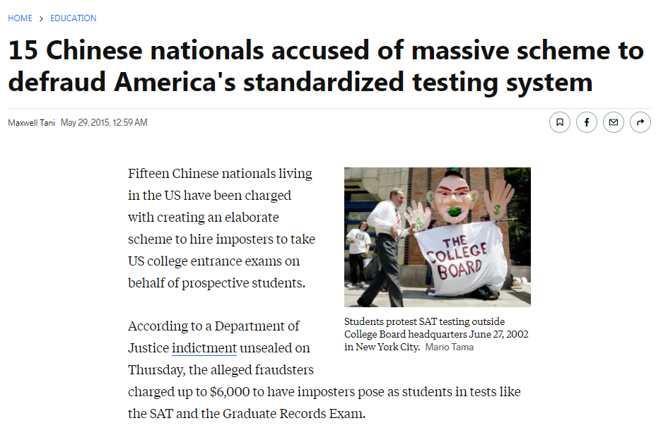 2015年,15名中国留学生涉嫌作弊,被美国检方起诉并定性为有组织犯罪。这些作弊学生花费高至6000美元的佣金雇佣枪手,伪造中国护照,代替他们进入考场,涉及的考试类别包括SAT、GRE和托福,涉案地点集中在宾夕法尼亚州匹兹堡。涉案人员年龄大多在19岁至26岁间。