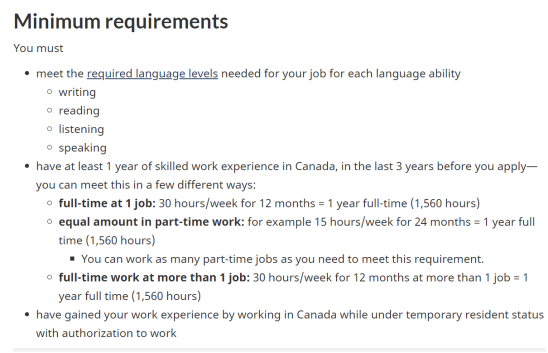 对留学生来说,在提出移民申请的前 3 年内,在加拿大至少已有 12 个月的全职工作经验(每周工作至少 30 小时,合计 1,560 小时),这个可以是多个全职工作,或工作时间总和相当于全职 12 个月的兼职工作经验;且所从事的职业属于加拿大职业分类辞典(NOC)职业等级为 0、A 或 B 等级(少数职业不开放申请);并达到最低的英语或法语能力要求,可依加拿大经验类移民类别提出移民申请。