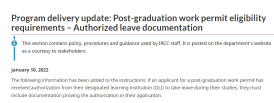 因为上面提过必须以全职学生身份就读并完成认可的课程才符合申请 PGWP 的资格,如果在读期间因为生病、停学或其他理由暂时休学的话,必须要获得就读院校的批准文件(Authorized leave documentation),学校出具的书面证明须在递交 PGWP 申请时一并提交。此外,休学时间不能超过 150 天。