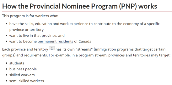 另外,各省和地区还可以根据自己劳动力需求状况,从“快速通道”系统,通过省提名项目(Provincial Nominee Programs,PNP)引进候选移民。