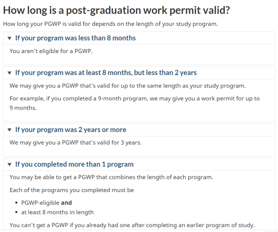 毕业后工作许可(PGWP)的有效期通常和完成的课程时长相同,但 8 个月以内的课程无法申请 PGWP,如果你完成的是 2 年或 2 年以上的课程,就能获得有效期 3 年的工作许可。