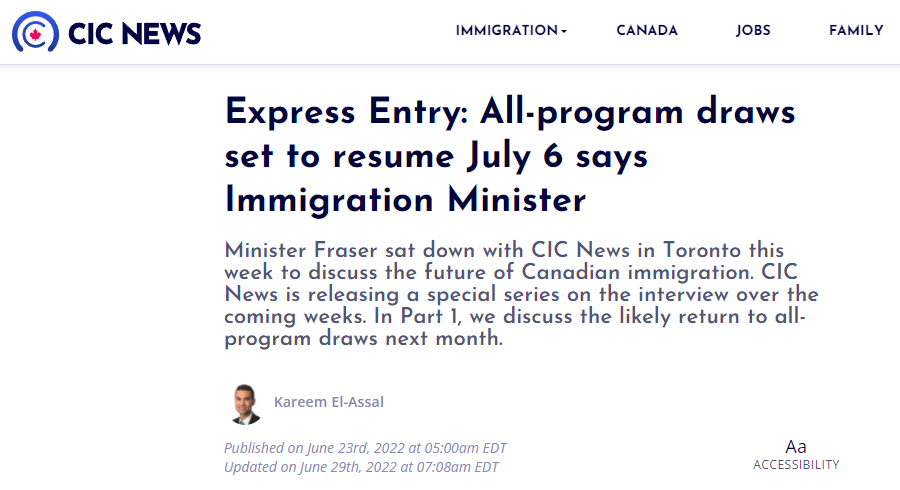 此前,加拿大移民部长 Sean Fraser 在接受 CIC NEWS 的独家专访时宣布:移民部将于 7 月 6 日正式恢复加拿大联邦快速通道(Express Entry)所有项目的筛选!