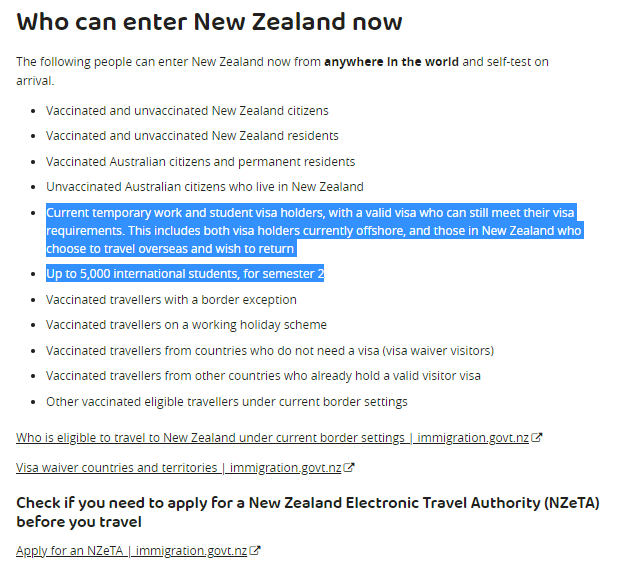 目前,仍符合签证签发要求的学生签证持有者,以及处于第二学期学习阶段的 5000 名国际学生可以入境新西兰,但仍需满足以下入境要求: