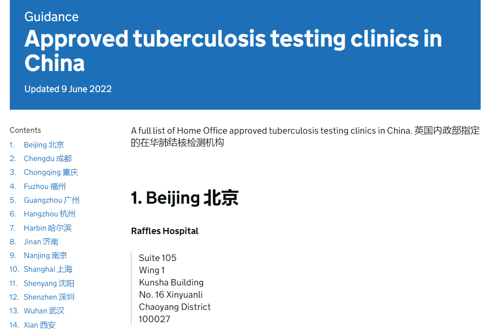 官网链接:https://www.gov.uk/government/publications/tuberculosis-test-for-a-uk-visa-clinics-in-china/approved-tuberculosis-testing-clinics-in-china