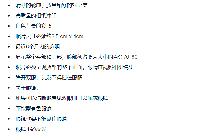 提交数码照片,照片必须包含整个脸部,面部必须清晰可见,没有头发遮挡眼睛且素颜,不配戴墨镜或彩色镜片,除宗教和医疗原因,头部不应有任何遮挡物。