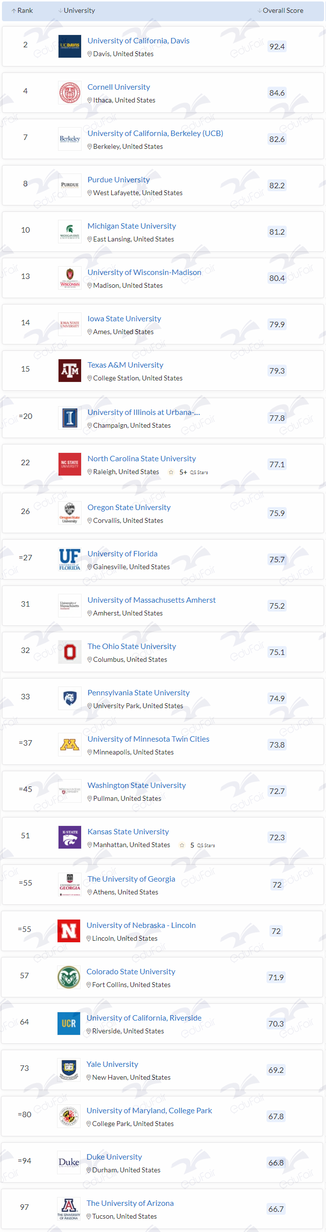 农学在美国也是传统学科,可以说,美国的农林类研究水平在全世界范围内都是非常强的,各个分支学科也都处在世界领先的地位。在 QS 农林学科世界大学 Top100 榜单上,美国有 26 所院校上榜。