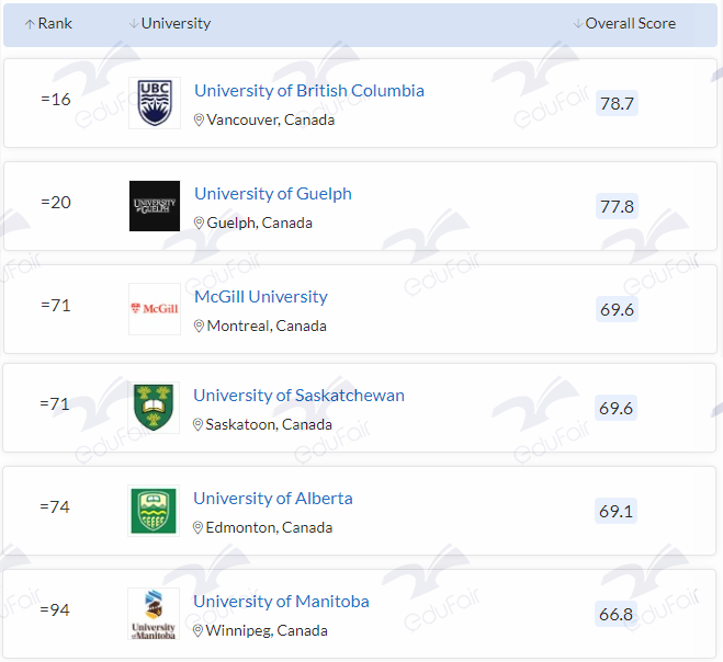 加拿大农业的教育质量也是世界顶级的,佼佼者当然是英属哥伦比亚大学和圭尔夫大学了,另外还有麦吉尔大学、萨斯喀彻温大学、阿尔伯塔大学、曼尼托巴大学,均进入了该领域的全球 TOP100。