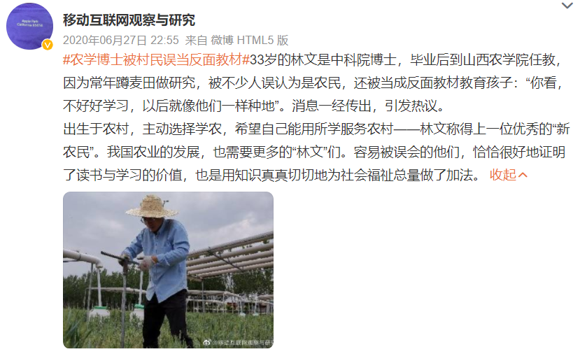 一位中科院农学博士,毕业后致力于研究旱作小麦水分和肥料的高效利用。因为常年蹲在地里,他被不少人误认为是农民,甚至还被当成反面教材教育孩子:“你看,不好好学习,以后就像他们一样种地!”