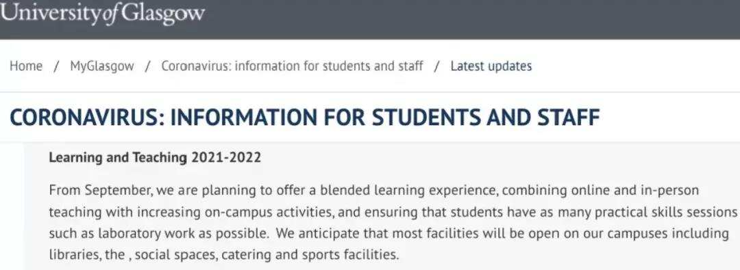 根据格拉斯哥大学发布的最新开学计划,9月开学,格拉斯哥大学将实行线上线下相结合的授课方式,在做好疫情防控保障安全的同时,尽可能地安排线下教学活动。