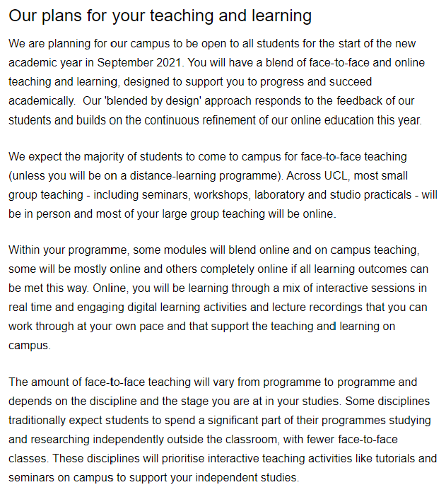 学校希望除了参加远程学习计划的同学,大多数同学能来校园进行面对面教学。面对面教学的数量会因课程而异,并取决于学科和您在学习中所处的阶段。目前,伦敦大学学院的硕士管理学专业已宣布2021/22学年课程全部线下进行,学生需在9月27日前返校。