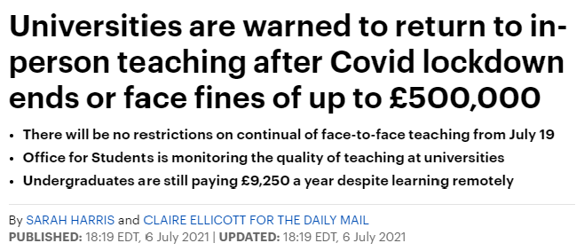 英国教育大臣加文·威廉姆森表示,7月19日起,各个大学恢复面对面教学将不设限制。如果后疫情时代,英国大学仍然不恢复线下授课教学,并且监管机构认为其教学质量大幅下降,则可能将面临高达50万英镑的罚款。