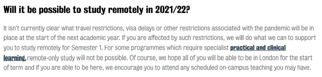 伦敦国王大学(KCL)在官网表示,学校希望所有学生都能在秋季学期开始时返回校园。如果学生受到旅行限制、签证延误等影响,学校将全力支持学生在第一学期上网课,但实践和临床类课程无法仅远程学习。