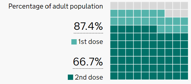 照理说,英国抗疫工作一直在持续推进。疫苗接种方面,目前全英已经有87.4%的人接种了第一剂,而第二剂也已经有66.7%的人接种。为什么感染数据持续上升?