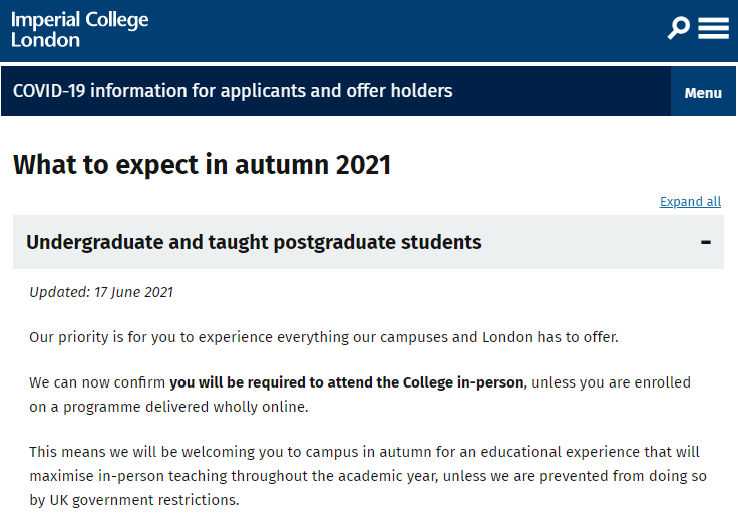 6月17日,帝国理工学院(IC )在官网更新了秋季开学安排。学校表示,除非你是全网课课程,否则学生秋季学期必须返回校园学习。