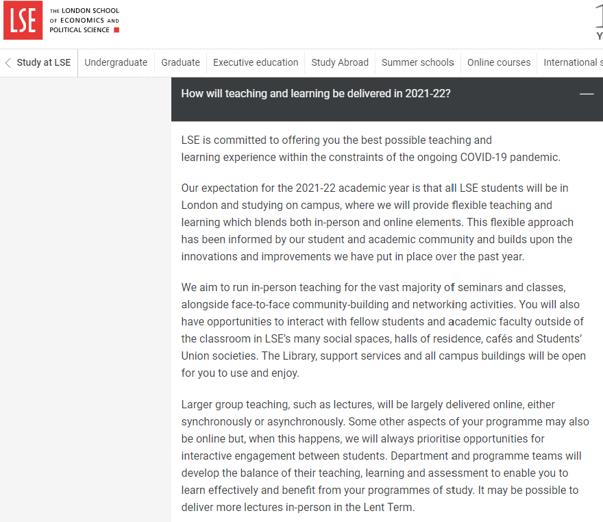 伦敦政治经济学院(LSE) 计划在2021/22学年提供灵活的教学模式,并希望所有学生返回伦敦校园内学习。
